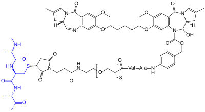 ![]() Chemical structure of tesirine (black) linked to a cysteine of camidanlumab (blue) | |