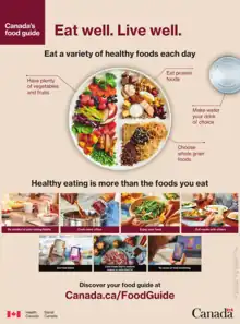 Canada's Food Guide (French: Guide alimentaire canadien) is a nutrition guide produced by Health Canada. In 2007, it was reported to be the second most requested Canadian government publication, behind the Income Tax Forms.[1] The Health Canada website states: "Food guides are basic education tools that are designed to help people follow a healthy diet."[2]