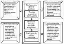 Cancer genome sequencing utilizes the same technology involved in whole genome sequencing. The history of sequencing has come a long way, originating in 1977 by two independent groups - Fredrick Sanger’s enzymatic didoxy DNA sequencing technique [26] and the Allen Maxam and Walter Gilbert chemical degradation technique.[27] Following these landmark papers, over 20 years later ‘Second Generation’ high-throughput next generation sequencing (HT-NGS) was born followed by ‘Third Generation HT-NGS technology’ in 2010.[28] The figures to the right illustrate the general biological pipeline and companies involved in second and third generation HT-NGS sequencing.