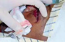Canthotomy (also called lateral canthotomy and canthotomy with cantholysis) is a surgical procedure where the lateral canthus, or corner, of the eye is cut to relieve the fluid pressure inside or behind the eye, known as intraocular pressure (IOC).[1] The procedure is typically done in emergency situations when the intraocular pressure becomes too high, which can damage the optic nerve and lead to blindness if left untreated.[2]