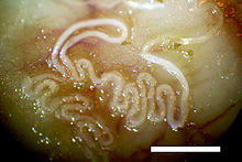 Capillaria aerophila is a nematode parasite found in the respiratory tract of foxes,[1] dogs,[2] and various other carnivorous mammals.[3] A few cases of human infestation have also been reported. Though it is sometimes called a "lungworm", this term usually refers to other species of nematodes. Infestation by C. aerophila is referred to as "pulmonary capillariasis" (occasionally spelled "capillariosis), "bronchial capillariasis", or (rarely) "thominxosis". This parasite has a direct life cycle, meaning that the life cycle can be completed in a single host. C. aerophila usually causes only minor clinical symptoms, such as irritation of the respiratory tract and coughing. However, secondary bacterial infections of the respiratory tract, including pneumonia, may develop in heavy infestations. Treatment with anthelmintics, such as levamisole or fenbendazole, is usually sufficient to cure C. aerophila infestations.