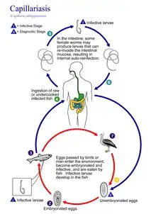 Capillaria philippinensis is a parasitic nematode which causes intestinal capillariasis. This sometimes fatal disease was first discovered in Northern Luzon, Philippines, in 1964. Cases have also been reported from China, Egypt, Indonesia, Iran, Japan, Korea, Lao PDR, Taiwan and Thailand.[1] Cases diagnosed in Italy and Spain were believed to be acquired abroad, with one case possibly contracted in Colombia.[2] The natural life cycle of C. philippinensis is believed to involve fish as intermediate hosts, and fish-eating birds as definitive hosts. Humans acquire C. philippinensis by eating small species of infested fish whole and raw.