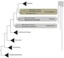 C. owczarzaki is together with Ministeria vibrans a member of the Filasterea clade.[10][1] This group is the sister group to a clade comprising Metazoa and Choanoflagellata, which together form the Filozoa[10][1][11] (See Figure 1). C. owczarzaki was originally described as nucleariids.[7] However, later molecular ribosomal phylogenies placed C. owczarzaki somewhere closer to animals than the rest of nucleariids.[12][13][14] Finally, a multi-gene phylogenetic analysis with several opisthokont taxa clearly showed that C. owczarzaki is not a nucleariid, but part of the Holozoa.[15][16] This was later on corroborated by phylogenomic analyses,[17][18] one of which [18] situated it as sister-group to Ministeria forming the Filasterea clade, which is the sister-group to Choanoflagellatea and Metazoa.[19][20]