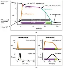 (b) The action potential for heart muscle is compared to that of skeletal muscle.[1]