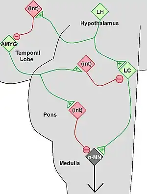 A phenomenon of REM sleep, muscular paralysis, occurs at an inappropriate time. This loss of tonus is caused by massive inhibition of motor neurons in the spinal cord. When this happens during waking, the patient who had a cataplectic attack loses muscular control. As in REM sleep, the person continues to breathe and is able to control eye movements.[9]