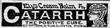 An 1896 ad for Elys Cream Balm, a catarrh remedy