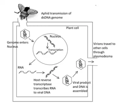Caulimoviruses achieve entry into plant cells via damaged tissues, transmission via an animal vector (aphid insects) and seeds passed down to generations. Plant cells do not possess receptors like animal cells that would allow the virus to enter and since plant cells are thick, viruses achieve entry as aforementioned. Once inside the plant, the virus spreads using plasmodesmata, a membrane channel found in plants connecting one plant cell to another. Caulimoviruses are para-retroviruses with a DNA genome; thus, part of their viral replication takes place in the nucleus, where the host replication machinery is utilized. The rest of its life cycle takes place in the cytoplasm. Replication follows, where initially the dsDNA enters the nucleus and is transcribed into RNA using the host RNA polymerase. Then, the RNA is reverse transcribed to viral DNA using the host reverse transcriptase [3] in the cytoplasm. The viral product is made and assembled in the cytoplasm, which then spreads to other parts of the plant cell using plasmodesmata. Translation takes place by ribosomal shunting. For most Caulimoviruses, their genome is not integrated into the host cell; however, some viruses, such as Dahlia mosaic virus (genus Caulimovirus), have been identified as having integrated their genome into the host. Transmission routes are mechanical.[1]