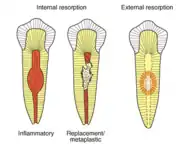 External resorption can be classified into four categories by its clinical and histologic manifestations: external surface resorption, external inflammatory root resorption, replacement resorption, and ankylosis. External inflammatory root resorption can be further categorized into cervical resorption with or without a vital pulp (invasive cervical root resorption) and external apical root resorption.[8]
