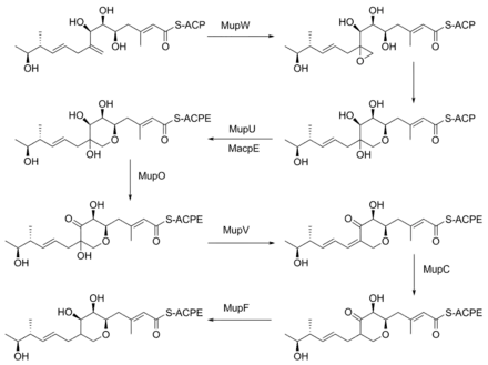 The formation of the pyran ring requires many enzyme-mediated steps (Figure 4). The double bond between C8 and C9 is proposed to migrate to between C8 and C16.[28] Gene knockout experiments of mupO, mupU, mupV, and macpE have eliminated PA-A production.[28] PA-B production is not removed by these knockouts, demonstrating that PA-B is not created by hydroxylating PA-A. A knockout of mupW eliminated the pyran ring, identifying MupW as being involved in ring formation.[28]