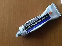 Mupirocin, sold under the brand name Bactroban among others, is a topical antibiotic useful against superficial skin infections such as impetigo or folliculitis.[5][6][7] It may also be used to get rid of methicillin-resistant S. aureus (MRSA) when present in the nose without symptoms.[6] Due to concerns of developing resistance, use for greater than ten days is not recommended.[7] It is used as a cream or ointment applied to the skin.[6]