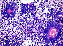 Medulloepithelioma, on the other hand, are tumors involving the constant cell division on the epithelium tissue where bundle of neuron endings are located.[1] Such tissue will differentiate into a similar form as the embryonic neural tube, also known as the starting structure of the central nervous system.[1][2][3] Medulloepitheliomas also present a pattern known as rosettes, characterized by the arrangement of a bundle of cells into circular shapes and around a center or a neuropil.[1] Ependymoblastoma also present rosettes as well as a higher density of cells.[1][3] It involves the process of differentiation into ependymal cells.[2][3]