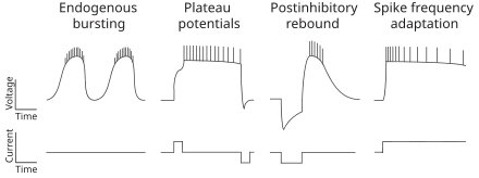 CPG neurons can have different intrinsic membrane properties (see schematic).[12] Some neurons fire bursts of action potentials, either endogenously or in the presence of neuromodulatory substances. Other neurons are bistable and generate plateau potentials that can be triggered by a depolarizing current pulse, and terminated by a hyperpolarizing current pulse. Many CPG neurons fire after being released from inhibition (postinhibitory rebound). Another common feature of CPG neurons is a decrease in the frequency of firing during a constant depolarization (spike frequency adaptation).