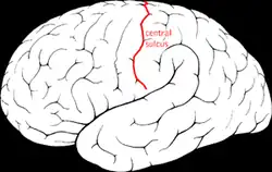 ![]() The lateral surface of the right cerebral hemisphere. The central sulcus is labeled on the top center, in red. The central sulcus separates the parietal lobe (blue) and the frontal lobe (lime green). | |