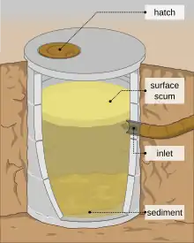 Cesspit, cesspool and soak pit in some contexts are terms with various meanings: they are used to describe either an underground holding tank (sealed at the bottom) or a soak pit (not sealed at the bottom).[1] A cesspit can be used for the temporary collection and storage of feces, excreta, or fecal sludge as part of an on-site sanitation system and has some similarities with septic tanks or with soak pits. Traditionally, it was a deep cylindrical chamber dug into the ground, having approximate dimensions of 1 metre (3') diameter and 2–3 metres (6' to 10') depth. Its appearance was similar to that of a hand-dug water well.
