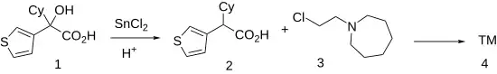The Clemmensen reduction of 3-thienylcyclohexyl-glycolic acid, CID:11064522 (1) gives cyclohexyl(thiophen-3-yl)acetic acid [16199-74-9] (2). Esterification of the sodium salt of the resulting acid with 1-(2-chloroethyl)azepane [2205-31-4] (3) produces cetiedil (4).