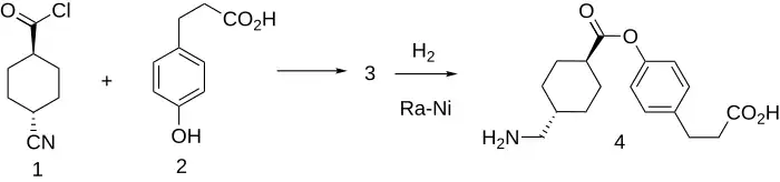 Cetraxate is a prodrug of tranexamic acid. The latter is a hemostatic agent because it inhibits the activation of plasminogen to plasmin. The result is to prevent excess loss of blood in gastrointestinal ulcers. The synthesis begins with the esterification of 3-(p-hydroxyphenyl)propionic acid (2) by trans-4-cyanocyclohexanecarbonyl chloride (1). The product (3) is reduced to cetraxate (4) by catalytic hydrogenation with hydrogen and Raney nickel.[3][4]