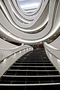 The building has 49,500 square metres (533,000 sq ft) of floor space and is six storeys tall with four basement levels. The centre can house 950 researchers and 1400 students, with both wet and dry laboratory spaces. The ground and basement levels contain clinical facilities in affiliation with the Royal Prince Alfred Hospital. The full-height interior atrium is reminiscent of the atrium inside the Guggenheim Museum in New York City. Having been called the "skeletal system of the building", the atrium features curved balconies and interconnecting sweeping stair cases, serving as the structural expression of the building's purpose. It is the most prominent and noticeable feature of the centre's interior. The curving atrium was designed by architects Francis-Jones Morehen Thorp[9] who collaborated with the Cubic Group responsible for the fabrication and installation of the primary atrium elements.[10] Additionally, it features a bank of glazed elevators common in atrium-style buildings.