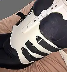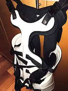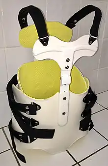Back braces are prescribed to treat adolescent idiopathic scoliosis, as they may stop the progression of spinal curvature in a growing child/adolescent. As of 2016, the Scientific Society on Scoliosis Orthopaedic and Rehabilitation Treatment (SOSORT) recommends bracing "is important, but does not have to be applied to all patients with this specific need"[2] for idiopathic scoliosis during growth. Multiple studies have provided strong evidence of bracing as an effective conservative treatment for children and adolescents and may also help decrease the amount of curvature in the spine;[3] with results lasting several decades following the end of treatment and brace weaning.[4] A variety of brace styles are available; the Boston brace is the most commonly used brace for adolescent idiopathic scoliosis (AIS). It is important to note that in-brace correction has been found to be directly related with treatment success,[5] suggesting in-brace correction should be maximized; thus individualized custom braces which maximize in-brace correction show better results. Other designs include the Milwaukee brace, the Charleston bending brace, the Peak Scoliosis Bracing System, and the SpineCor (a soft brace) in the United States, Canada, and Europe. In Europe, however, the SPoRT and Cheneau and Crass Cheneau braces are also used. There has been considerable research and information published in reputable journals on back braces for scoliosis. Issues like patient compliance with treatment, the psycho-social impact of brace use, and exercise with bracing have been looked at. Quality of Life research has been attempted but is difficult due to a current lack of instruments. Bracing is the primary treatment for AIS in curves that are considered to be moderate in their severity and are likely due to progress (determined by curve pattern/type and the patient's structural maturity).
