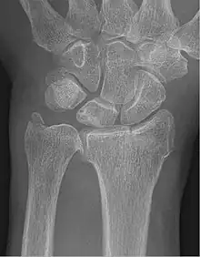 Chauffeur's fracture, also known as Hutchinson fracture, is a type of intraarticular oblique fracture of the radial styloid process in the forearm.[1] The injury is typically caused by compression of the scaphoid bone of the hand against the styloid process of the distal radius. It can be caused by falling onto an outstretched hand. Treatment is often open reduction and internal fixation, which is surgical realignment of the bone fragments and fixation with pins, screws, or plates.