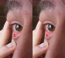 Chemosis is the swelling (or edema) of the conjunctiva. The term derives from the Greek words cheme and -osis, cheme meaning cockleshell due to the swollen conjunctiva resembling it, and -osis meaning condition.[1] The swelling is due to the oozing of exudate from abnormally permeable capillaries. In general, chemosis is a nonspecific sign of eye irritation. The outer surface covering appears to have fluid in it. The conjunctiva becomes swollen and gelatinous in appearance. Often, the eye area swells so much that the eyes become difficult or impossible to close fully.[2] Sometimes, it may also appear as if the eyeball has moved slightly backwards from the white part of the eye due to the fluid filled in the conjunctiva all over the eyes except the iris. The iris is not covered by this fluid and so it appears to be moved slightly inwards.