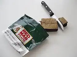 Plug chewing tobacco is tobacco leaves pressed into a square, brick-like mass called a plug. From this, pieces are bitten off or cut from the plug and then chewed. Plug tobacco is declining in popularity, and is thus less readily available than loose-leaf chewing tobacco. Historically, plug tobacco could be either smoked in a pipe or chewed, but today, these are two distinct products.