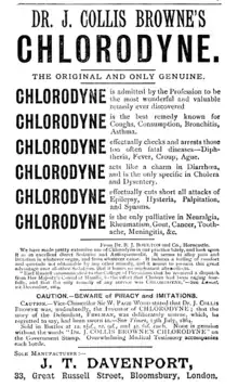 Chlorodyne was one of the best known patent medicines sold in the British Isles. It was invented in the 19th century by a Dr. John Collis Browne, a doctor in the British Indian Army; its original purpose was in the treatment of cholera. Browne sold his formula to the pharmacist John Thistlewood Davenport, who advertised it widely, as a treatment for cholera, diarrhea, insomnia, neuralgia, migraines, etc. As its principal ingredients were a mixture of laudanum (an alcoholic solution of opium), tincture of cannabis, and chloroform, it readily lived up to its claims of relieving pain, as a sedative, and for the treatment of diarrhea.