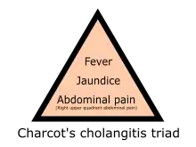 Dr Jean-Martin Charcot, working at the Salpêtrière Hospital in Paris, France, is credited with early reports of cholangitis, as well as his eponymous triad, in 1877.[4] He referred to the condition as "hepatic fever" (fièvre hépatique).[4][7] Dr Benedict M. Reynolds, an American surgeon, reignited interest in the condition in his 1959 report with colleague Dr Everett L. Dargan, and formulated the pentad that carries his name.[5] It remained a condition generally treated by surgeons, with exploration of the bile duct and excision of gallstones, until the ascendancy of ERCP in 1968.[25] ERCP is generally performed by internal medicine or gastroenterology specialists. In 1992 it was shown that ERCP was generally safer than surgical intervention in ascending cholangitis.[26]