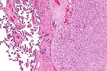 Micrograph of a chorangioma (right of image) and normal placenta (left of image); H&E stain.