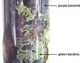 Light absorption changes also according to the type of habitat: the photic zone in sediments is less extensive compared to that in the water, in fact, while in the latter the penetration depth of light is many meters, sediment particles strongly reduce the amount of light entering, and this is the reason why phototrophic bacteria in sediments often form thinner layers within the uppermost millimeters.[3][28] Sulfate present in the sediments is metabolised to sulfide by sulfate-reducing bacteria and the sulfide thus produced diffuses upwards into the water column. Then, sulfide forms a vertical gradient with an opposite trend to that of the light, which on the contrary decreases going downwards.[4] This is the reason why these bacteria can find their optimal growth conditions in small areas of overlap between the countercurrent gradients of the above-mentioned factors.[29][30]