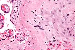 | Micrograph of a chronic deciduitis, showing the characteristic plasma cells. H&E stain. | |