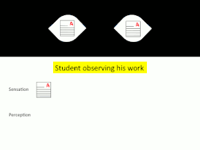 Overall, chronostasis occurs as a result of a disconnection in the communication between visual sensation and perception. Sensation, information collected from our eyes, is usually directly interpreted to create our perception. This perception is the collection of information that we consciously interpret from visual information.[7] However, quick eye movements known as saccades disrupt this flow of information. Because research into the neurology associated with visual processing is ongoing, there is renewed debate regarding the exact timing of changes in perception that lead to chronostasis.[8] However, below is a description of the general series of events that lead to chronostasis, using the example of a student looking up from his desk toward a clock in the classroom.