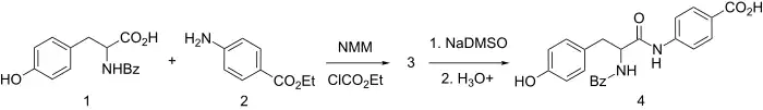 It is synthesized by amide formation between ethyl p-aminobenzoate and N-benzoyl-tyrosine using N-methyl-morpholine and ethyl chlorocarbonate for activation. The resulting L-amide is selectively hydrolyzed by sequential use of dimsyl sodium (NaDMSO) and dilute acid to give bentiromide (4).