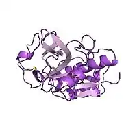 Chymopapain's structure was solved by X-ray diffraction techniques.[3] Analysis of this structure showed chymopapain to have 7 alpha helix regions, 10 beta sheet regions and 2 loop turns.[3] These 2 turns are the main difference between chymopapain's structure and other papaya proteinase proteins such as papain or caricain, which have similar conformations.[11][12]