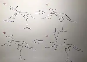 - The cysteine makes a bond with the carbon breaking the carbon's double bond with oxygen and converting it into a simple bond.