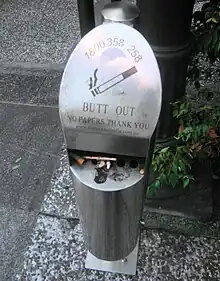- ↑ Novotny T, Lum K, Smith E, Wang V, Barnes R (2009). "Cigarette Butts and the Case for an Environmental Policy on Hazardous Cigarette Waste". International Journal of Environmental Research and Public Health. 6 (5): 1691–1705. doi:10.3390/ijerph6051691. PMC 2697937. PMID 19543415.