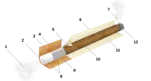 Manufacturers have described the cigarette as "a drug administration system for the delivery of nicotine in acceptable and attractive form".[28][29][30][31] Modern commercially manufactured cigarettes are seemingly simple objects consisting mainly of a tobacco blend, paper, PVA glue to bond the outer layer of paper together, and often also a cellulose acetate–based filter.[32] While the assembly of cigarettes is straightforward, much focus is given to the creation of each of the components, in particular the tobacco blend. A key ingredient that makes cigarettes more addictive is the inclusion of reconstituted tobacco, which has additives to make nicotine more volatile as the cigarette burns.[33]