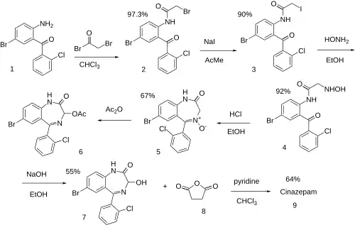 The reaction between 2-amino-5-bromo-2'-chlorobenzophenone [60773-49-1] (1) and bromoacetyl bromide [598-21-0] gives 5-bromo-2'-chloro-2-bromoacetamido-benzophenone, PC33695403 (2). Finkelstein reaction with sodium iodide gives PC11375008 (3). Reaction with hydroxylamine preferentially causes alkylation by displacement of the leaving group than oxime formation. Hence, the product of this step is PC129780422 (4). Ring closure in acid led to Phenazepam 4-Oxide [1177751-52-8] (5). Treatment with acetic anhydride and Polonovski rearrangement gave PC630731 (6). Saponification of the ester yielded 3-Hydroxyphenazepam [70030-11-4] (7). Treatment with succinic anhydride completed the synthesis of Cinazepam (8).