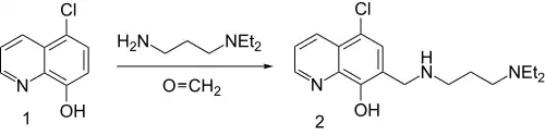 Thus, Mannich condensation of the hydroxyquinoline (1) with formaldehyde and N,N-diethylpropylenediamine affords clamoxyquin (2).