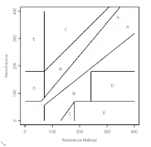 To perform the analysis, blood glucose samples are obtained and each sample is divided and measured by two meters: a "reference method" (a meter or laboratory test known to produce accurate results); and a new meter being evaluated. A scatterplot is generated, plotting values from the reference glucose meter (x-axis) against values from the new device (y-axis); thus, each point represents measurement of a single sample by two methods.