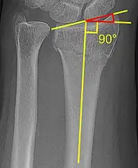 The radial inclination of a distal radius fracture is shown in red in image at right. The angle is measured between:[4][5]