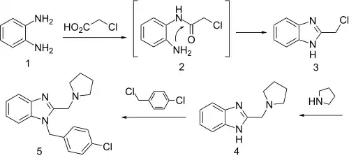 Reaction of that compound with chloroacetic acid can be rationalized by invoking initial formation of the chloromethyl amide. Imide formation with the remaining free amino group closes the ring to afford 2-chloromethyl benzimidazole (3). Displacement of halogen with pyrrolidine affords the alkylation product. The proton on the fused imidazole nitrogen is then removed by reaction with sodium hydride. Treatment of the resulting anion with α,4-dichlorotoluene gives the H1 antihistaminic agent clemizole (5).