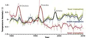 - 1 2 Hawkins, Ed (12 September 2019). "Atmospheric temperature trends". Climate Lab Book. Archived from the original on 12 September 2019. (Higher-altitude cooling differences attributed to ozone depletion and greenhouse gas increases; spikes occurred with volcanic eruptions of 1982–83 (El Chichón) and 1991–92 (Pinatubo).)