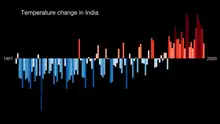 Temperatures in India have risen by 0.7 °C (1.3 °F) between 1901 and 2018, thereby changing the climate in India.[33]