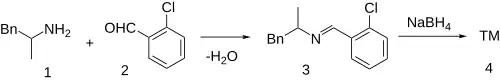 Condensation between amphetamine (1) and 2-chlorobenzaldehyde (2) gives a Schiff-base, CID:135056236 (3). Subsequent reduction with sodium borohydride completed the synthesis of clobenzorex (4).