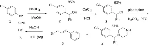 The reduction of 4-Chlorobenzophenone [134-85-0] (1) with NBH gives 4-Chlorobenzhydrol [119-56-2] (2). Halogenation of the alcohol in muriatic acid afforded 4-Chlorobenzhydryl chloride [134-83-8] (3). Alkylation with one equivalent of piperazine gives 1-(4-Chlorobenzhydryl)piperazine [303-26-4] (4). Alkylation of the remaining nitrogen with Cinnamyl Bromide [4392-24-9] (5) completed the synthesis of Clocinizine (6).