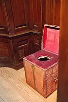 Records of the English court mention the "close stool" and detail its construction.[1] As an example, the furniture maker and upholsterer William Green made a "close stool" in August 1537 for the Lady Mary. The stool was upholstered with crimson velvet and a silkwoman, Mistress Margery Vaughan, provided crimson silk fringes and ribbons for its decoration. Green made a leather carrying case for the stool.[2] Close stools belonging to Cardinal Wolsey were covered with scarlet cloth and black velvet.[3] Lady Jane Grey ordered crimson velvet to cover two close stools in July 1553.[4]