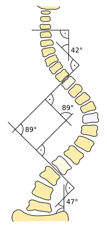 It is defined as the greatest angle at a particular region of the vertebral column, when measured from the superior endplate of a superior vertebra to the inferior endplate of an inferior vertebra.[1] However, the endplates are generally parallel for each vertebra, so not all sources include usage of a superior versus inferior endplate in the definition.[2]