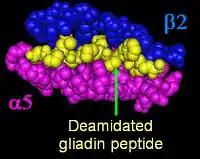 The response to the 33mer occurs in most coeliacs who have a DQ2 isoform. This peptide, when altered by intestinal transglutaminase, has a high density of overlapping T-cell epitopes. This increases the likelihood that the DQ2 isoform will bind, and stay bound to, peptide when recognised by T-cells.[78] Gliadin in wheat is the best-understood member of this family, but other prolamins exist, and hordein (from barley), secalin (from rye), and avenin (from oats) may contribute to coeliac disease.[28][52][79] Avenin's toxicity in people with coeliac disease depends on the oat cultivar consumed, as prolamin genes, protein amino acid sequences, and the immunoreactivities of toxic prolamins vary among oat varieties.[20]