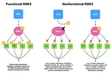 Mutations in the RPS6KA3 gene can result in expression of an RSK2 protein (ribosomal S6 kinase 2) with reduced or absent kinase function. RSK2 is a downstream component of the MAPK (mitogen-activated protein kinase) cascade that is itself a kinase. RSK2 phosphorylates cellular proteins (including histone H3, and CREB), which regulate eukaryotic gene expression. In individuals with Coffin–Lowry syndrome, phosphorylation of transcriptional regulators is reduced due to the weakened activity of RSK2 kinase activity. RSK2 is normally activated by the ERK MAP kinase. Mutated RSK2 may be deficient for activation by ERK, or its kinase activity may be reduced despite activation by ERK. The most common mutation in RPS6KA3 is an early stop codon that fails to produce a functional protein, indicating that disease etiology most likely arises from loss-of-function effects. Substitution mutations (which alter a single amino acid) have also been shown to give rise to the disease. RSK2 is highly expressed in the brain, specifically in the neocortex, hippocampus, and Purkinje cells, all of which are involved in cognitive function and behavior. There is some experimental evidence that RSK2 regulates synaptic transmission and plasticity in neuronal cell types.[3]