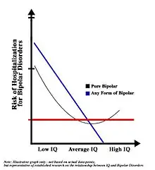 Bipolar disorder is a mood disorder characterized by periods of elevated mood known as mania or hypomania and periods of depression. Anecdotal and biographical evidence popularized the idea that those with bipolar disorder are tormented geniuses that are uniquely equipped with high levels of creativity and superior intelligence.[30] Bipolar disorder is relatively rare, affecting only 2.5% of the population, as it is also the case with especially high intelligence. The uncommon nature of the disorder and rarity of high IQ pose unique challenges in sourcing large enough samples that are required to conduct a rigorous analysis of the association between intelligence and bipolar disorder.[31] Nevertheless, there has been much progress starting from the mid-90s, with several studies beginning to shed a light on this elusive relationship.[32]